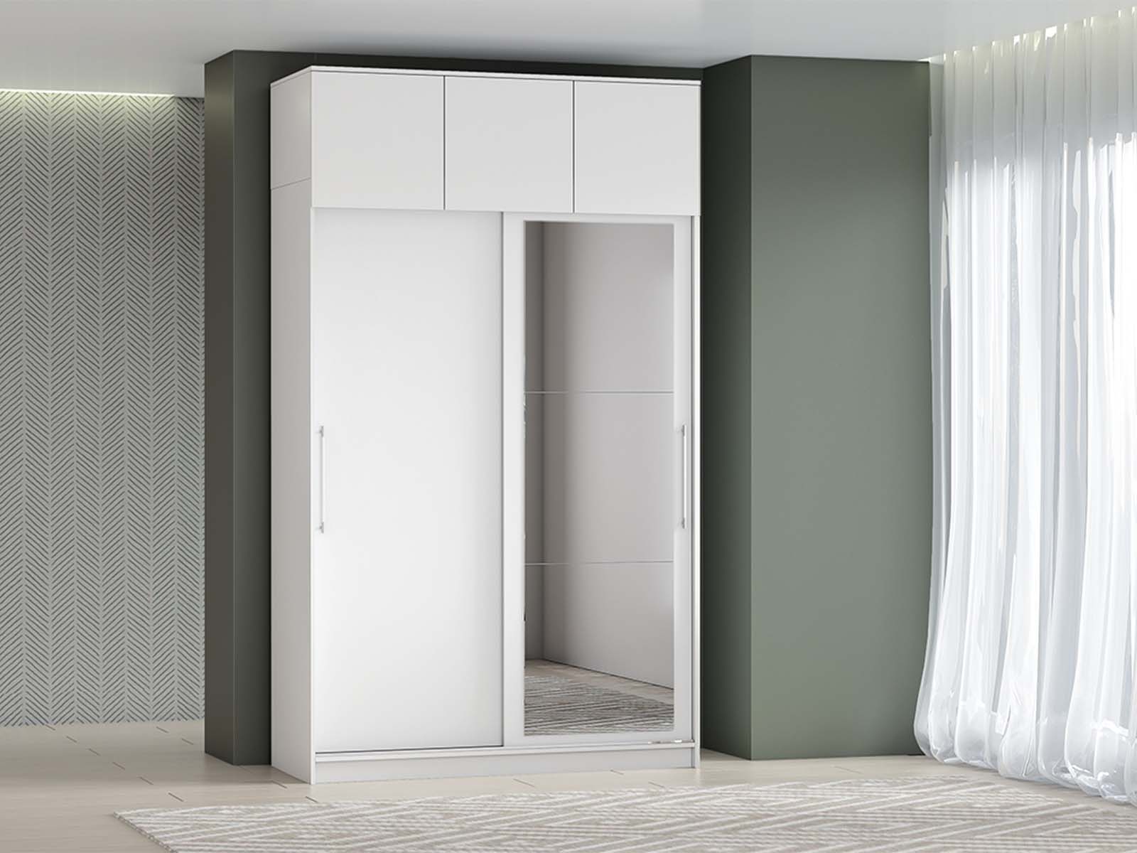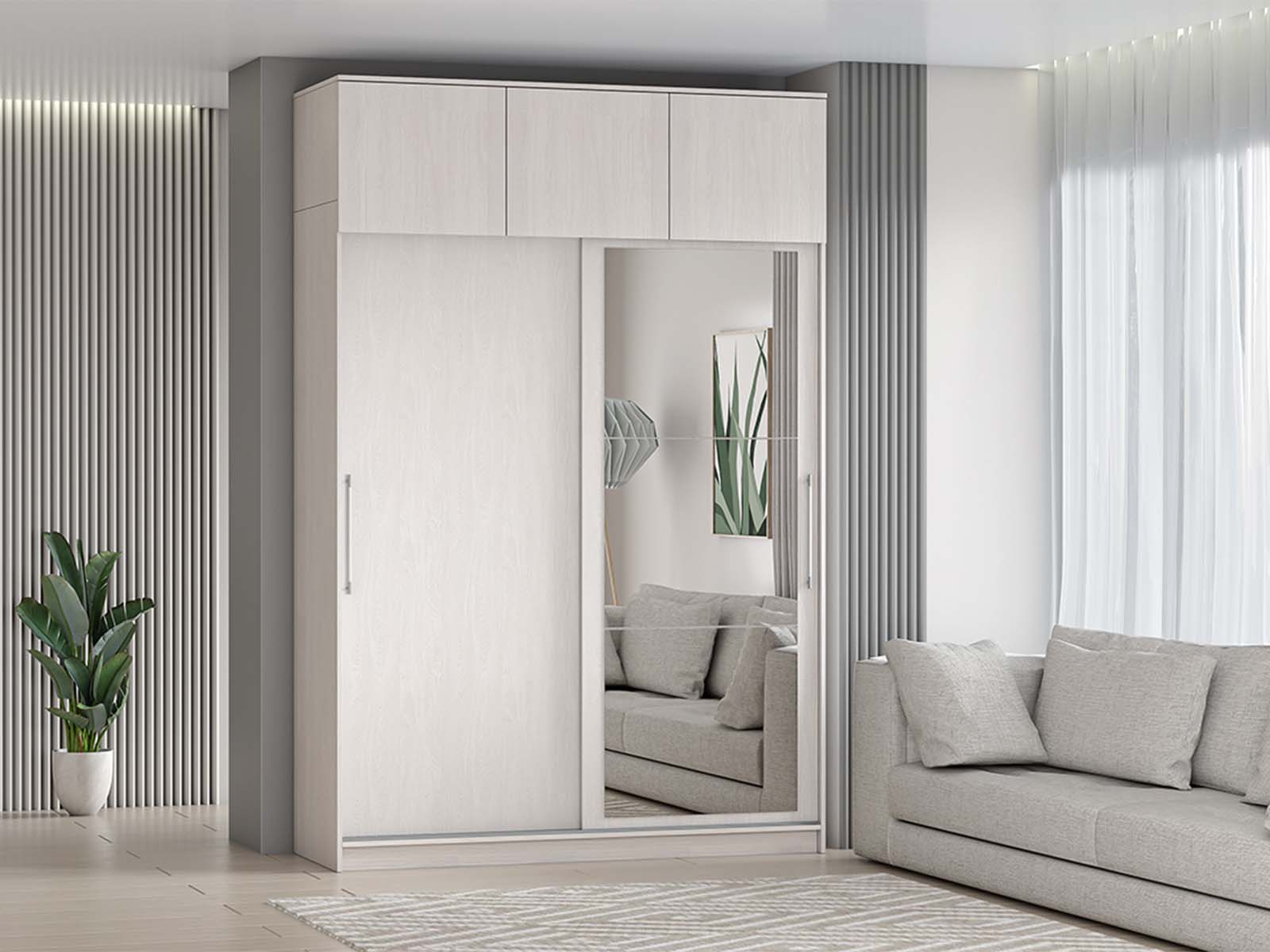 Шкаф-купе арт. 007 1,7м с антресолью и зеркалом - Модель оснащена двумя раздвижными дверцами (глухой и зеркальной) и тремя распашными секциями. Внутри — полки, штанга для вешалок и два выдвижных ящика. Зеркало визуально расширяет комнату, а антресоль добавляет места для хранения.