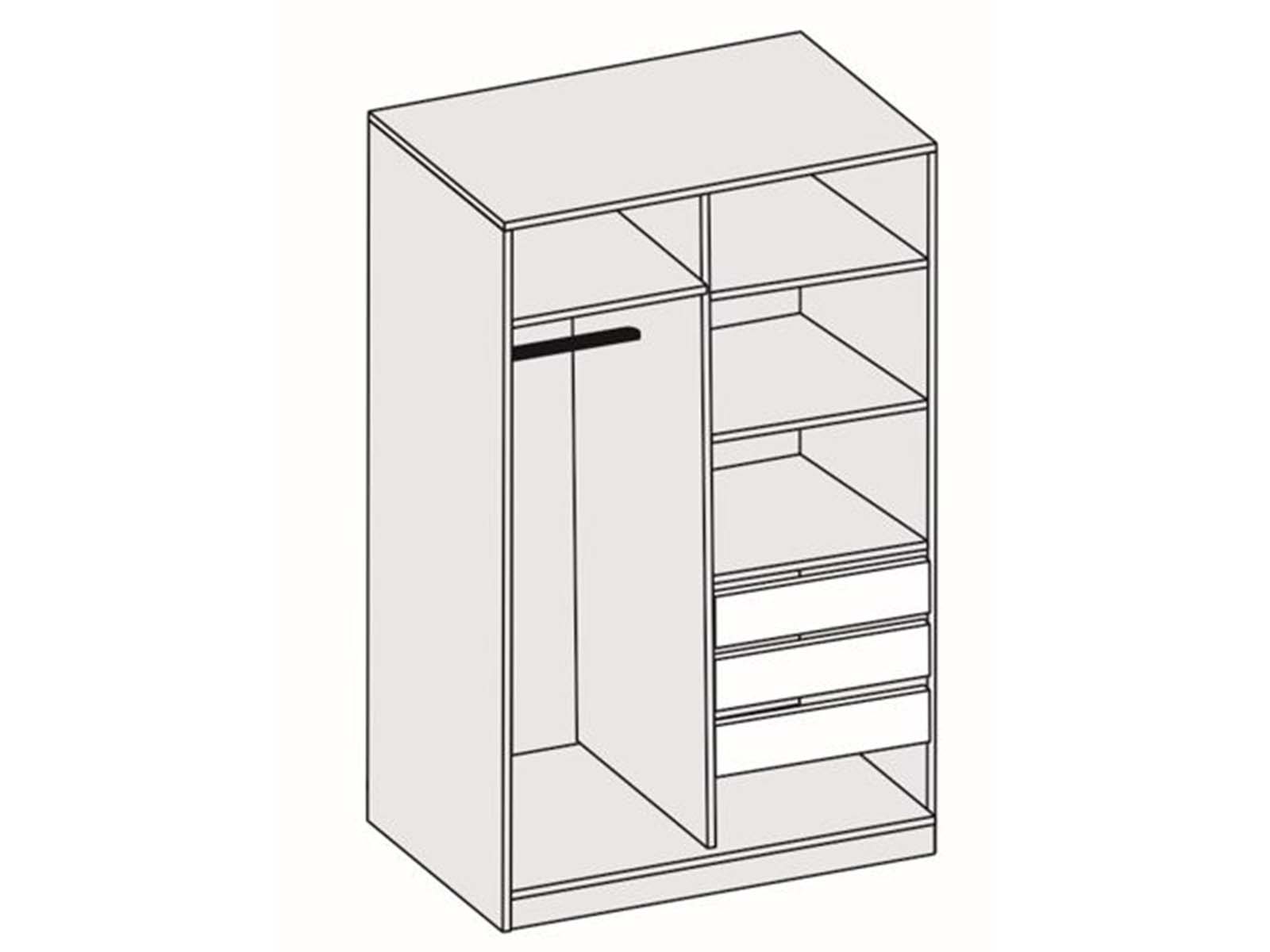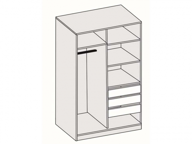 Шкаф-купе арт. 011 - с зеркальным фасадом и раздвижной системой дверей. Внутреннее пространство организовано зонально: слева — антресоль и штанга для одежды, справа — три полки и три выдвижных ящика. Зеркало визуально увеличивает помещение, а роликовые направляющие обеспечивают плавное выдвижение ящиков.