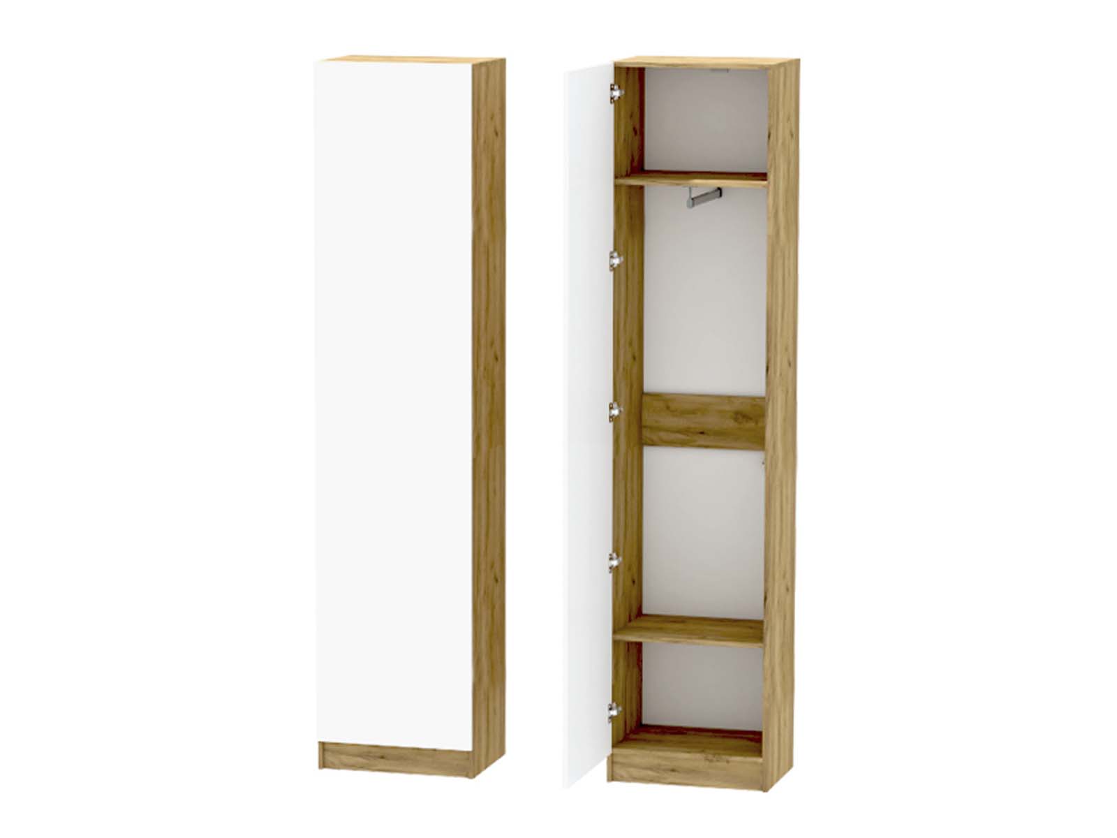 Пенал Иннэс-10, дуб крафт золотой/белый - компактный помощник для хранения одежды в прихожей или спальне. За глухой распашной дверцей скрываются вместительные полки и удобная штанга для плечиков. Всё необходимое — под рукой, но не на виду. Просто, функционально, стильно.