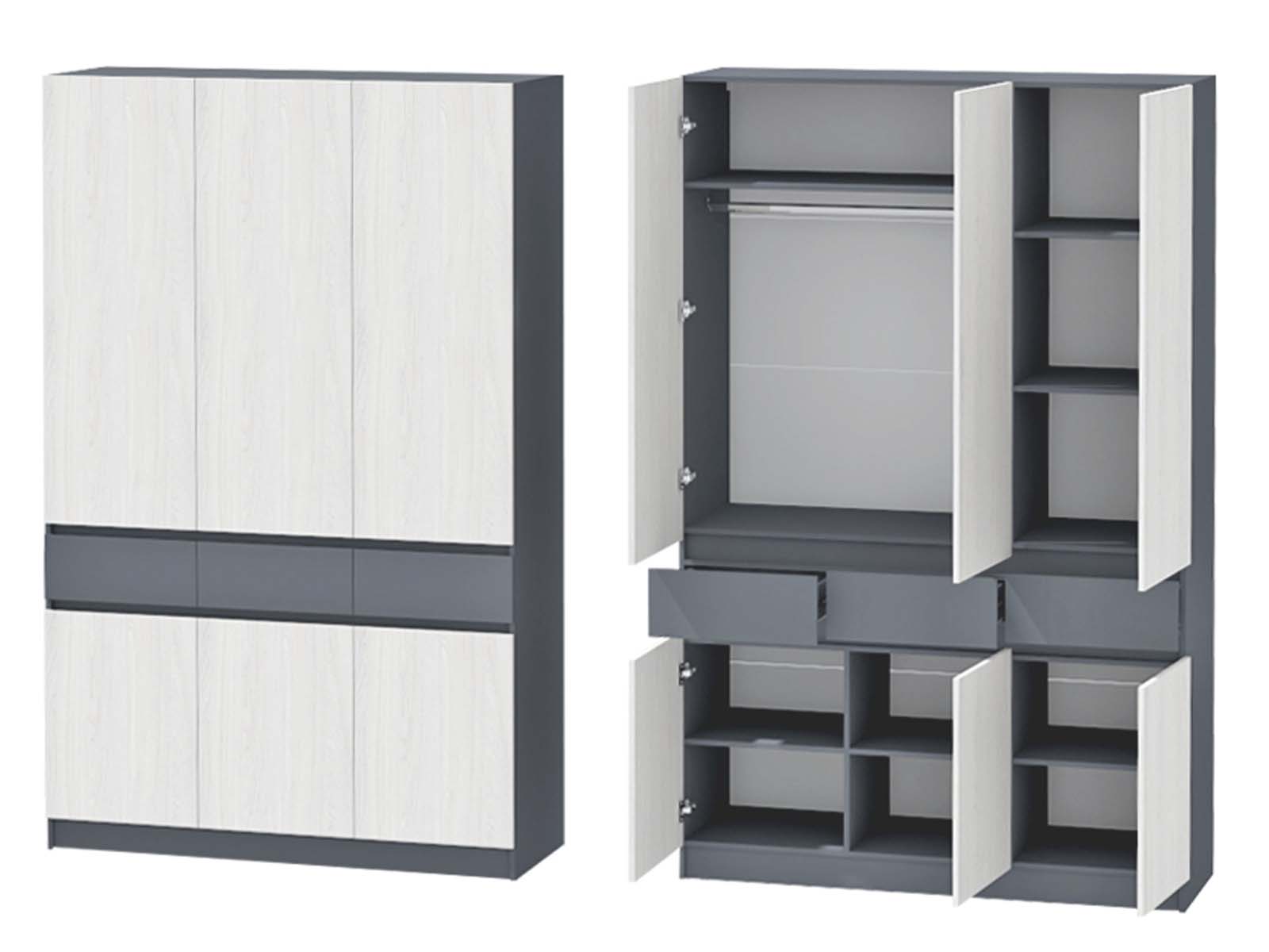 Шкаф 3-х створчатый Иннэс-10, графит/ясень анкор светлый - с тремя глухими дверцами — золотая середина между компактностью и вместительностью. Внутреннее пространство продумано до мелочей: удобные полки, три выдвижных ящика для белья и аксессуаров, а также надёжная штанга для одежды на плечиках. Всё, что нужно для идеального порядка.