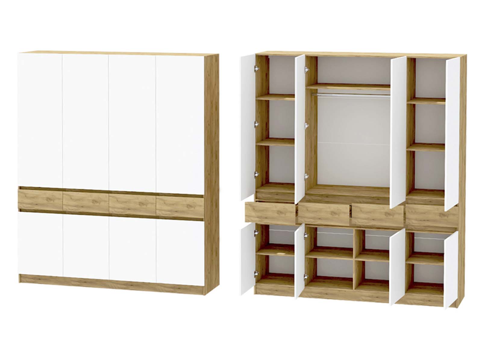 Шкаф 4-х створчатый Иннэс-10, дуб крафт золотой/белый - это серьёзный запас пространства для всей семьи. Внутри ждут: полки для белья, четыре выдвижных ящика для аксессуаров и штанга для верхней одежды. Ничего лишнего снаружи, всё под рукой внутри. Порядок без компромиссов.