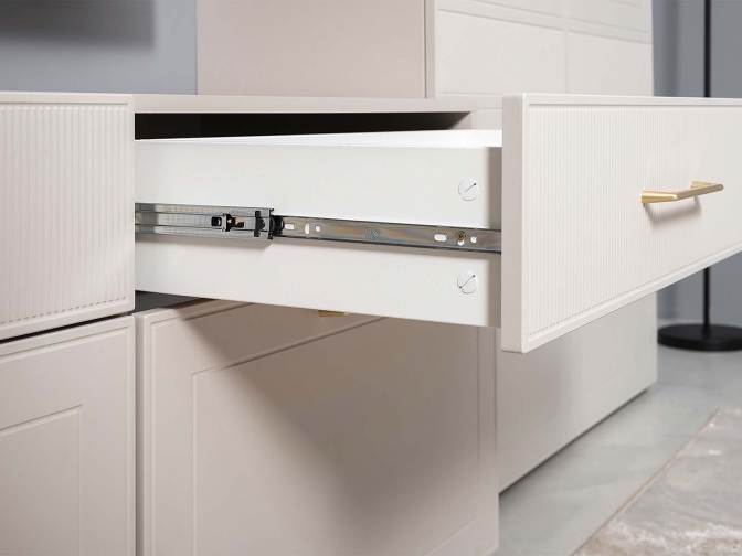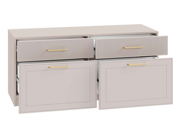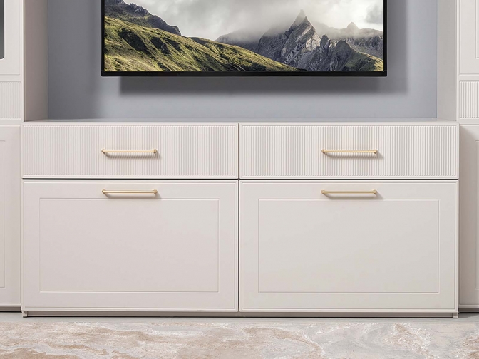 Тумба под ТВ Ричфорд 16.61 - Коллекция «Ричфорд» воплощает современную классику, где каждая деталь продумана для вашего комфорта. Фрезерованные фасады из МДФ в сочетании с металлическими ручками и тонированными стеклянными витринами создают элегантный облик. А умные решения — доводчики, система полного выдвижения ящиков, выдвижная штанга для одежды и регулируемые полки — делают организацию пространства невероятно удобной.