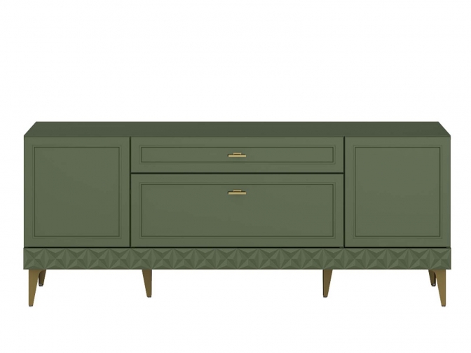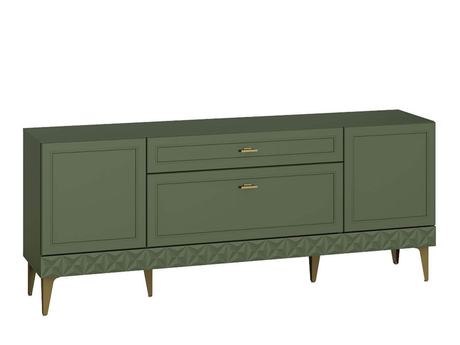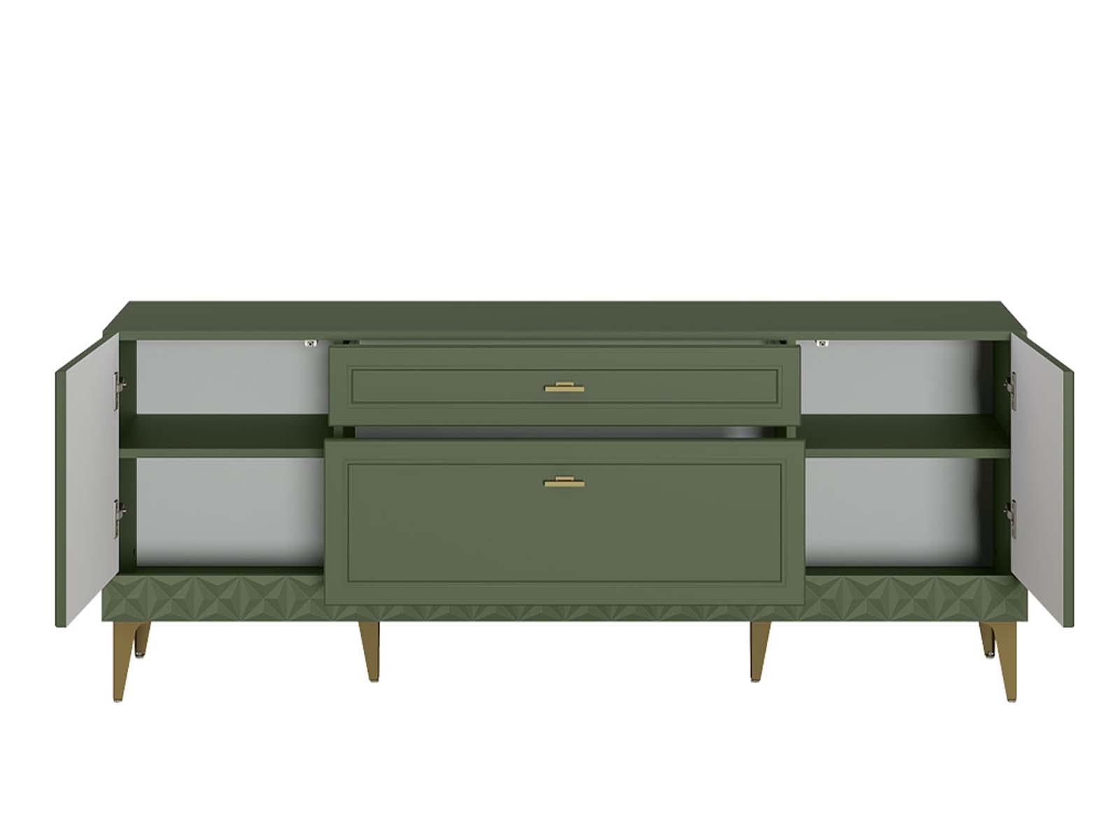 Тумба под ТВ Марион 16.167 Дымчатый зеленый/Олива шагрень - тумба для техники с продуманной эргономикой. Модель объединяет выдвижные ящики и закрытые секции с полками, предлагая гибкую систему хранения. Металлические ручки и ножки добавляют конструктивности, а минималистичный дизайн делает её универсальным решением для гостиной или спальни.