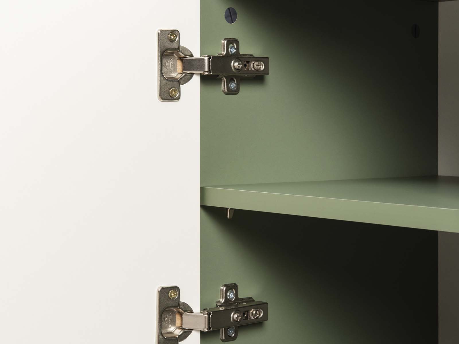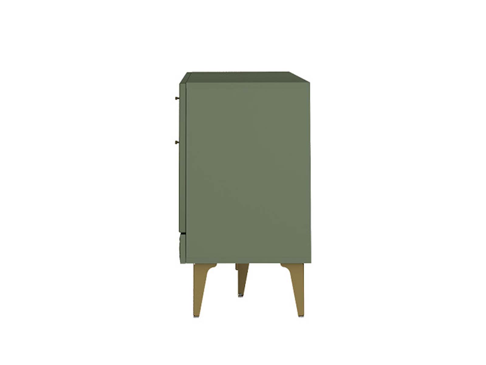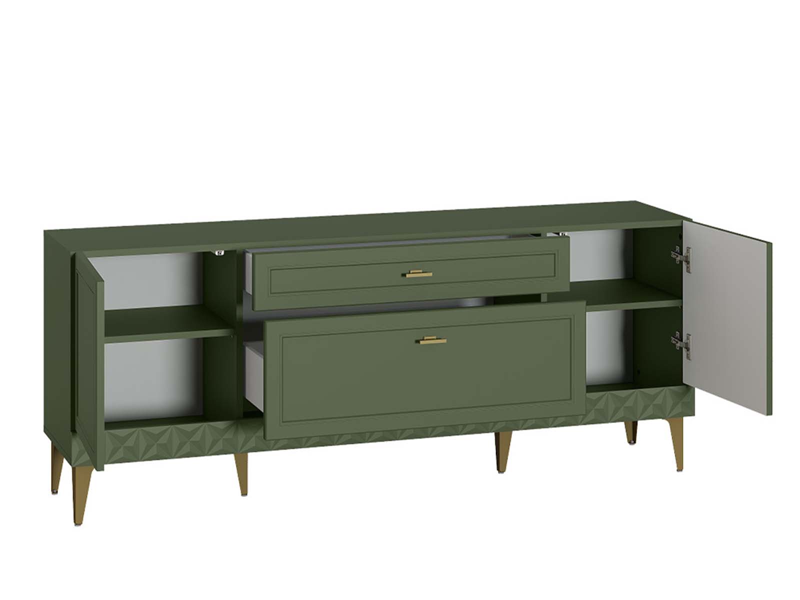 Тумба под ТВ Марион 16.167 Дымчатый зеленый/Олива шагрень - тумба для техники с продуманной эргономикой. Модель объединяет выдвижные ящики и закрытые секции с полками, предлагая гибкую систему хранения. Металлические ручки и ножки добавляют конструктивности, а минималистичный дизайн делает её универсальным решением для гостиной или спальни.