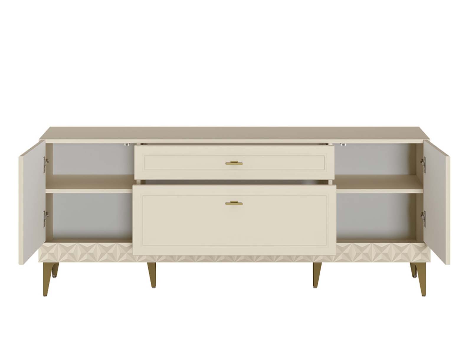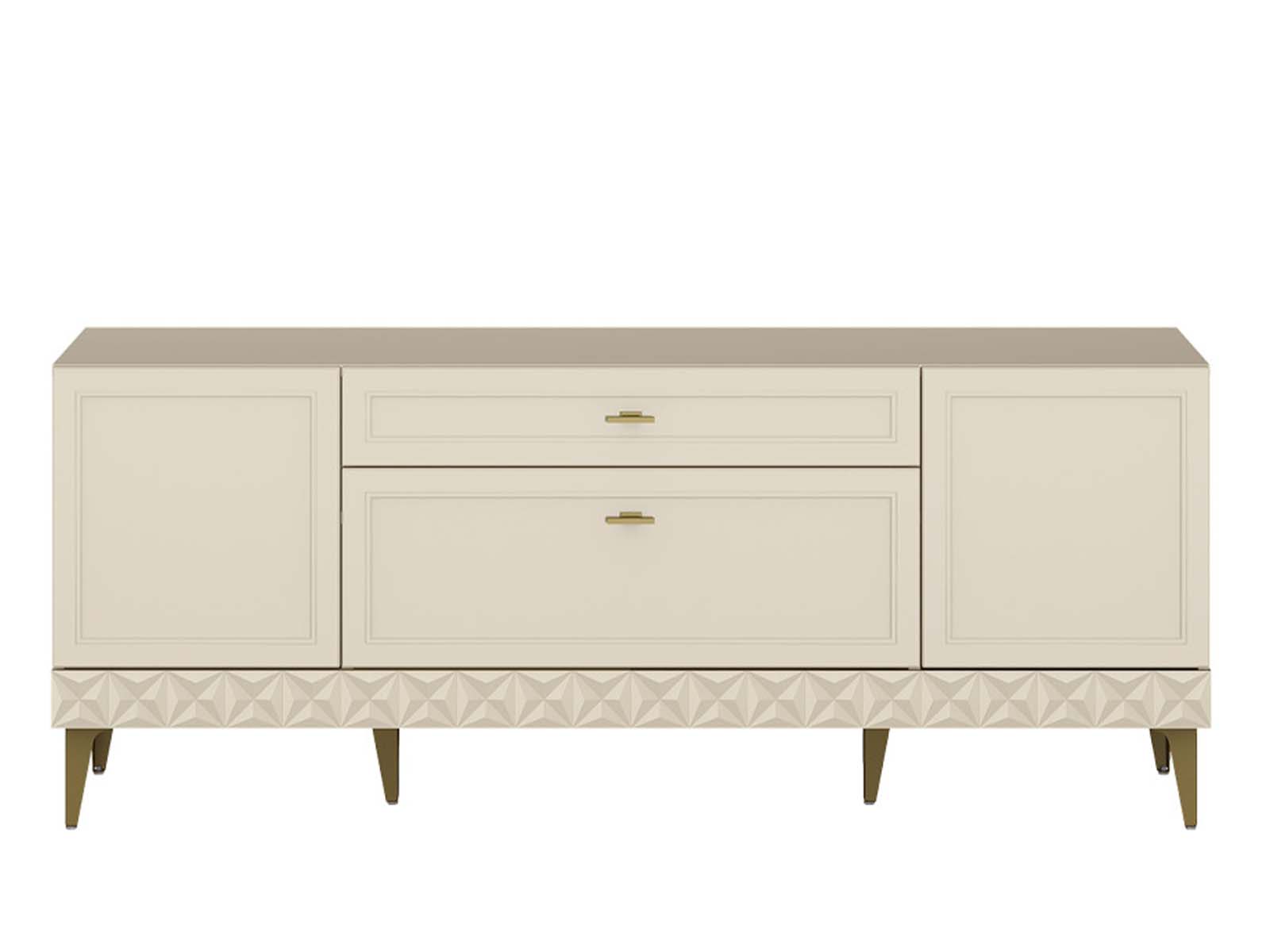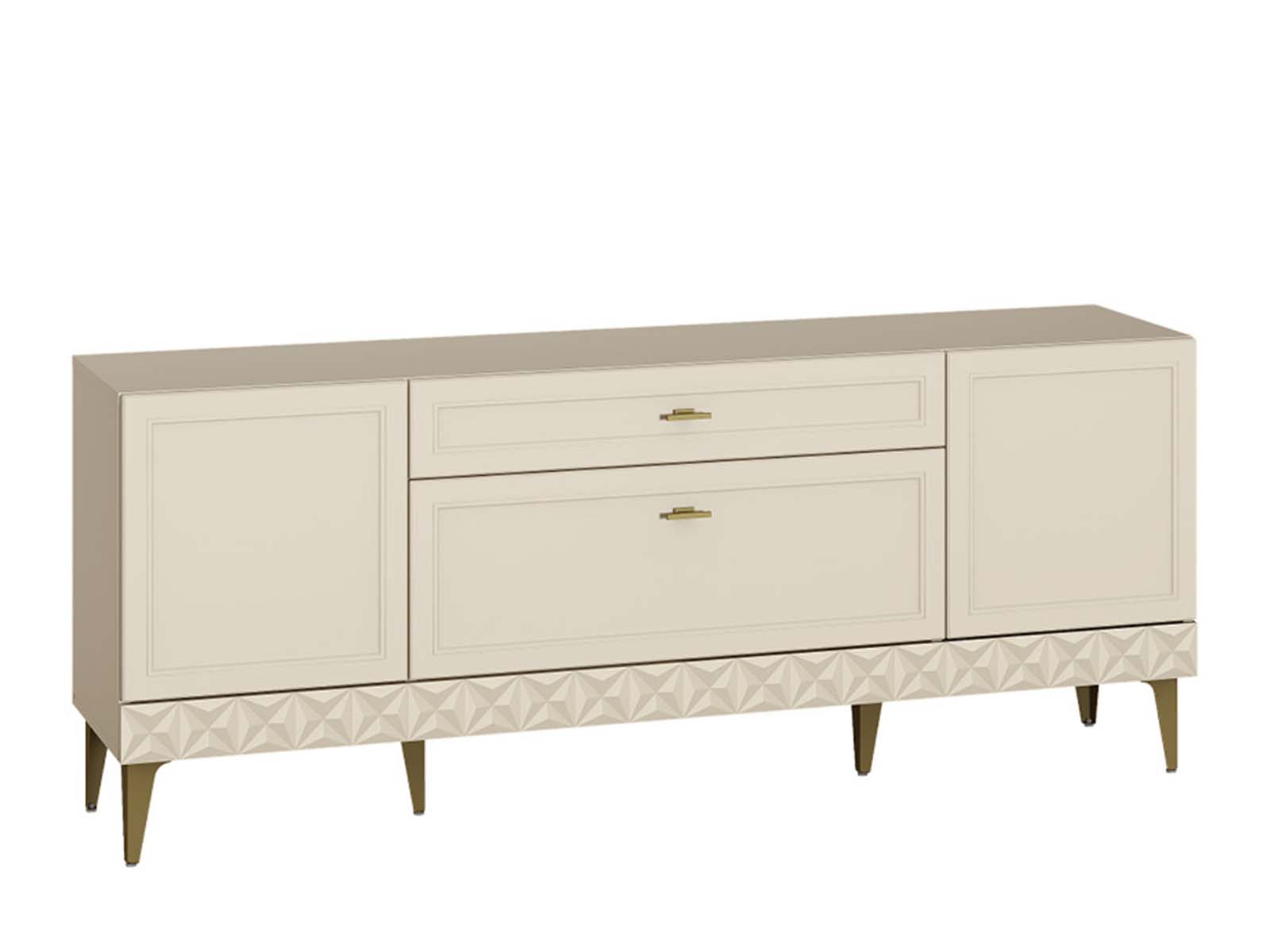 Тумба под ТВ Марион 16.167 Слоновая кость - тумба для техники с продуманной эргономикой. Модель объединяет выдвижные ящики и закрытые секции с полками, предлагая гибкую систему хранения. Металлические ручки и ножки добавляют конструктивности, а минималистичный дизайн делает её универсальным решением для гостиной или спальни.