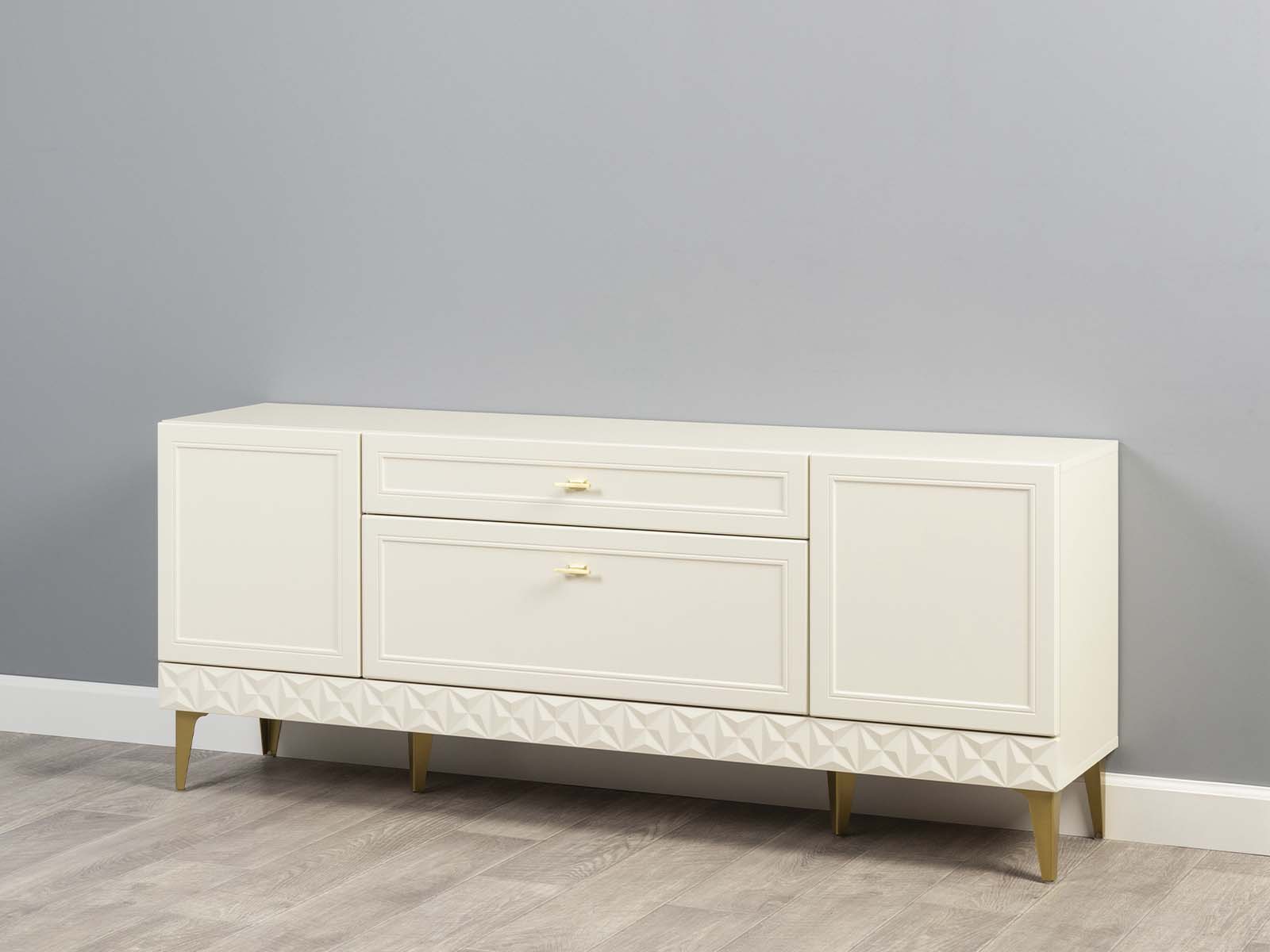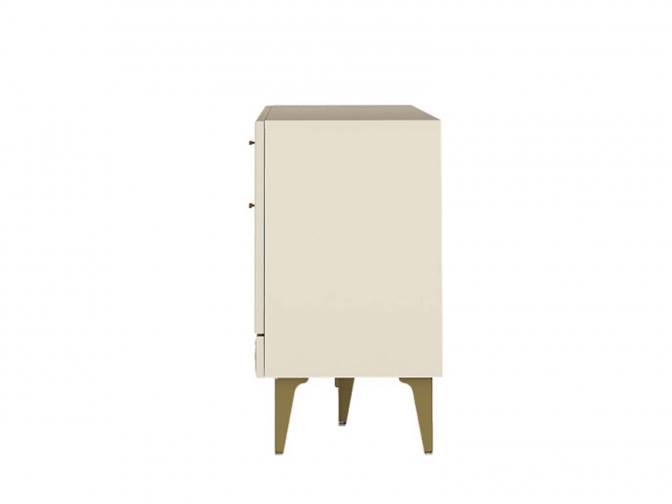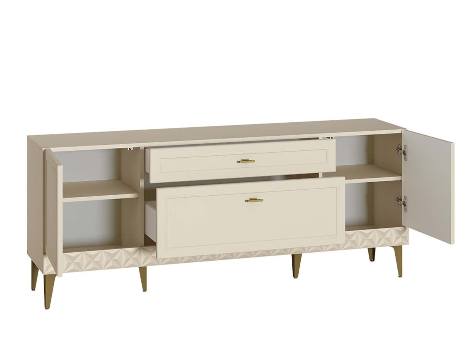 Тумба под ТВ Марион 16.167 Слоновая кость - тумба для техники с продуманной эргономикой. Модель объединяет выдвижные ящики и закрытые секции с полками, предлагая гибкую систему хранения. Металлические ручки и ножки добавляют конструктивности, а минималистичный дизайн делает её универсальным решением для гостиной или спальни.