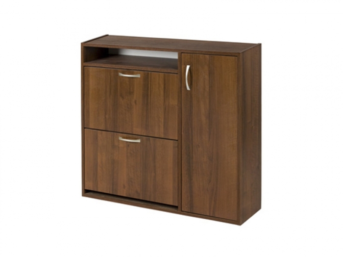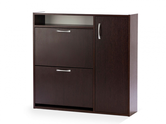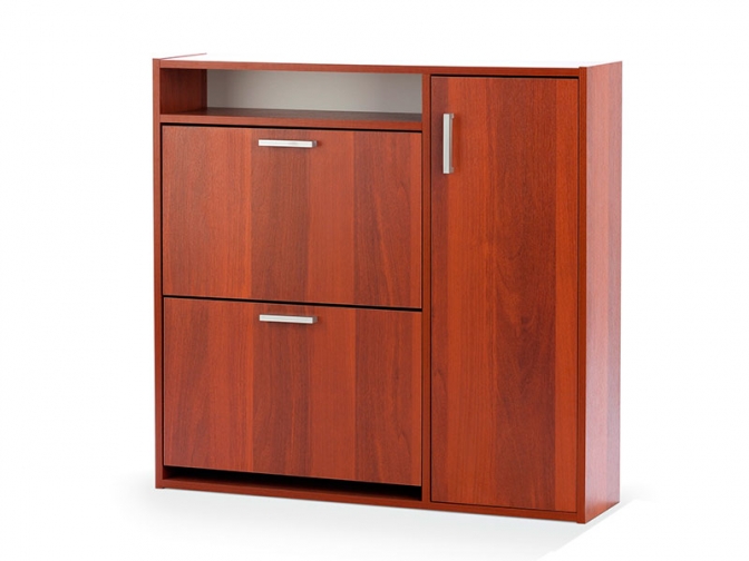 Обувница ШК-2 – экономичное решение для небольшой прихожей. Имеет 2 ящика с выездным механизмом, в которых скрыты наклонные полки для обуви. Боковое отделение состоит из полок, на которых также можно хранить обувь или другие вещи. За счет наклонного расположения обувь легко доставать из тумбы или помещать ее внутрь.