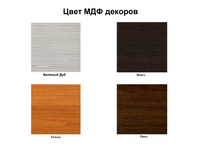 Возможные цвета МДФ накладок: Венге, Ольха, Орех и Беленый Дуб