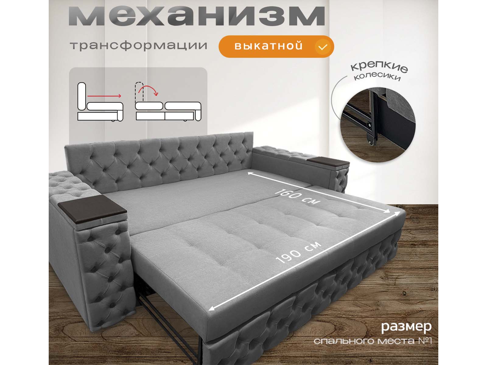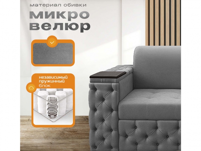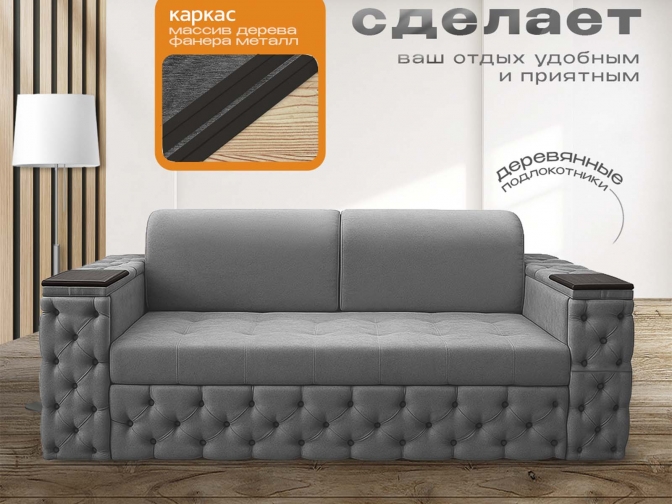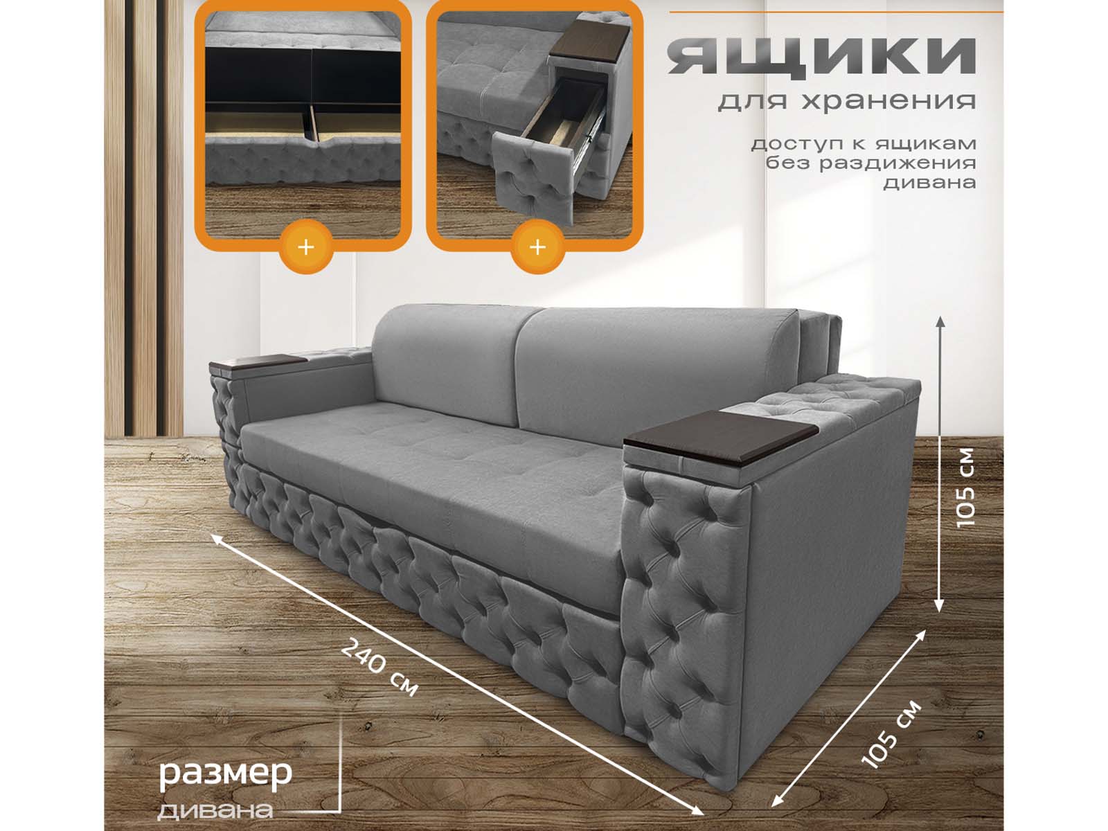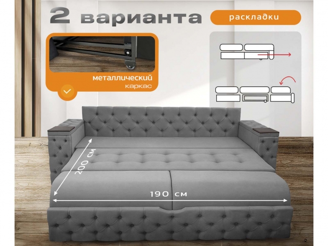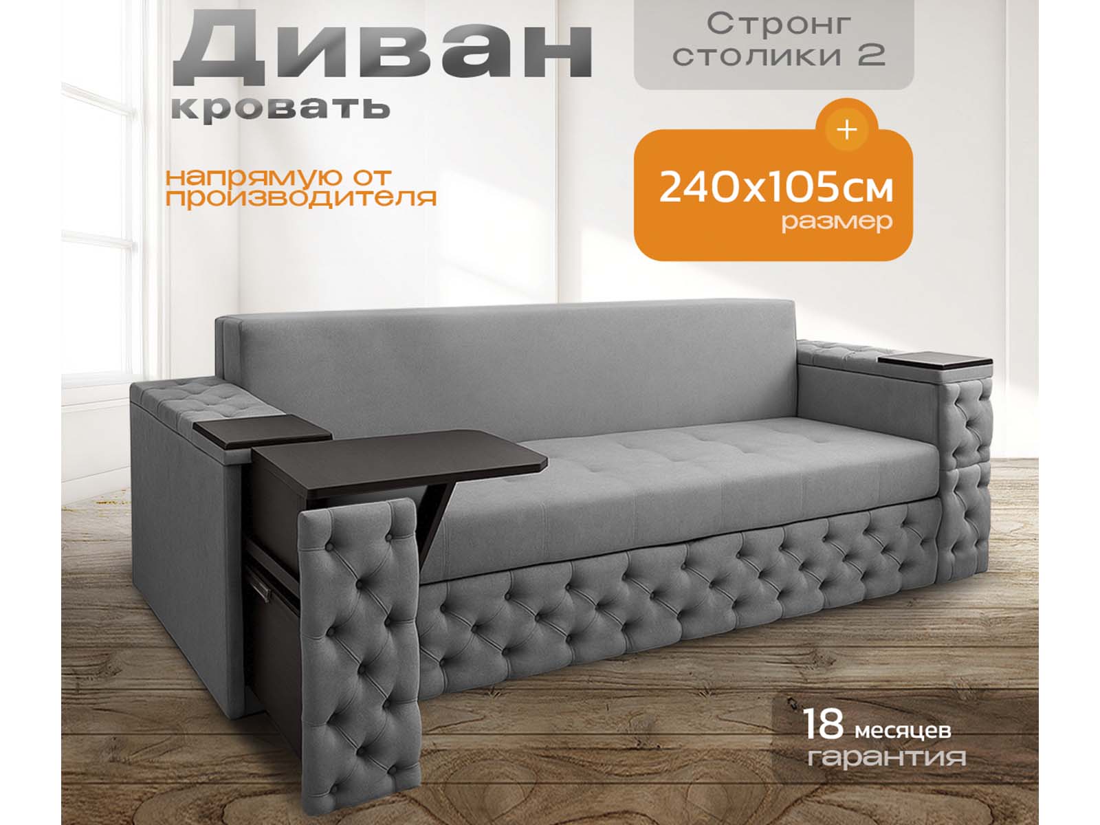 Диван Айсберг каретка+столики, декоры на подлокотниках, на металлокаркасе, спальное 190x200, независимый пружинный блок, тройная трансформация / серый