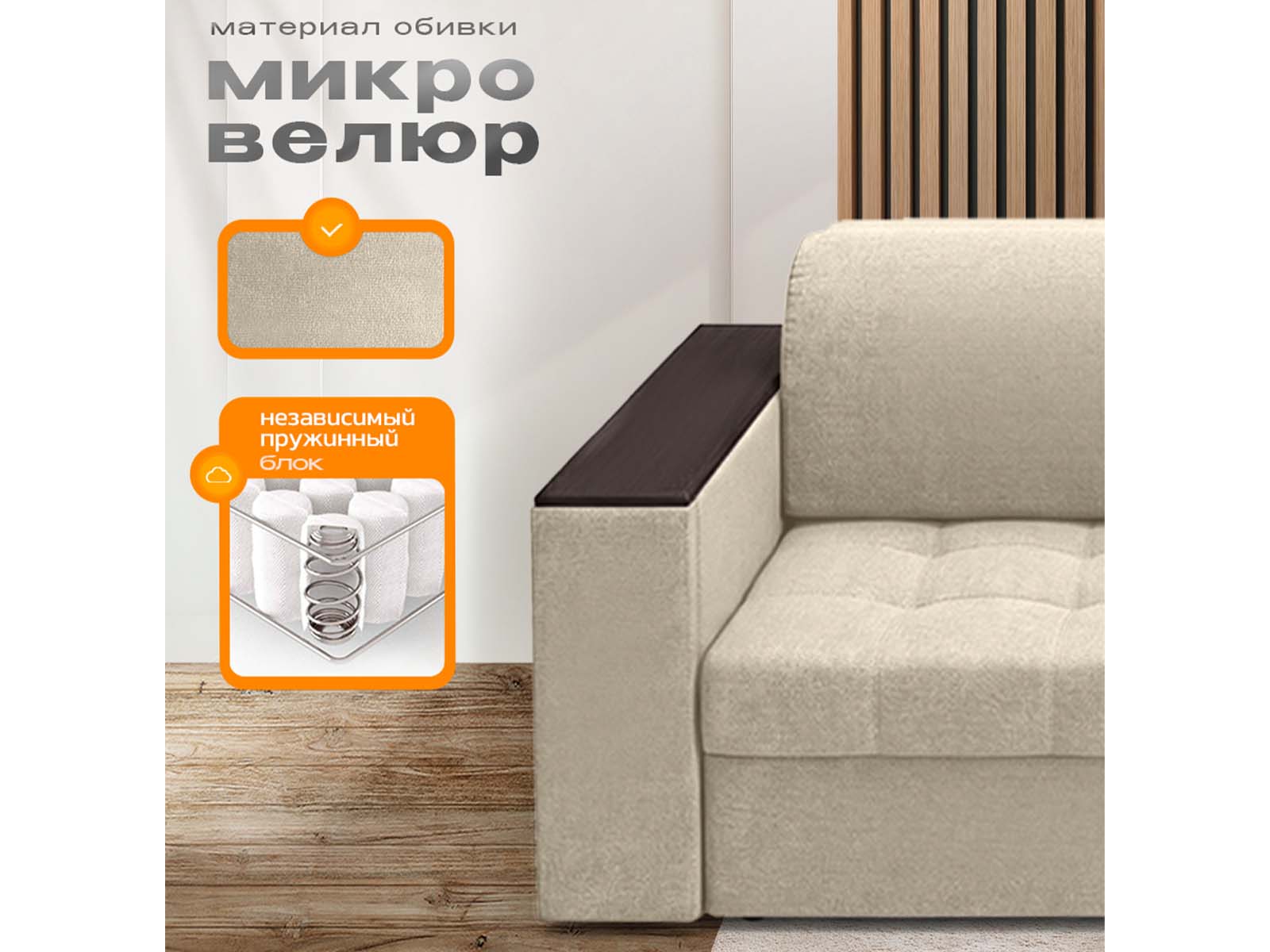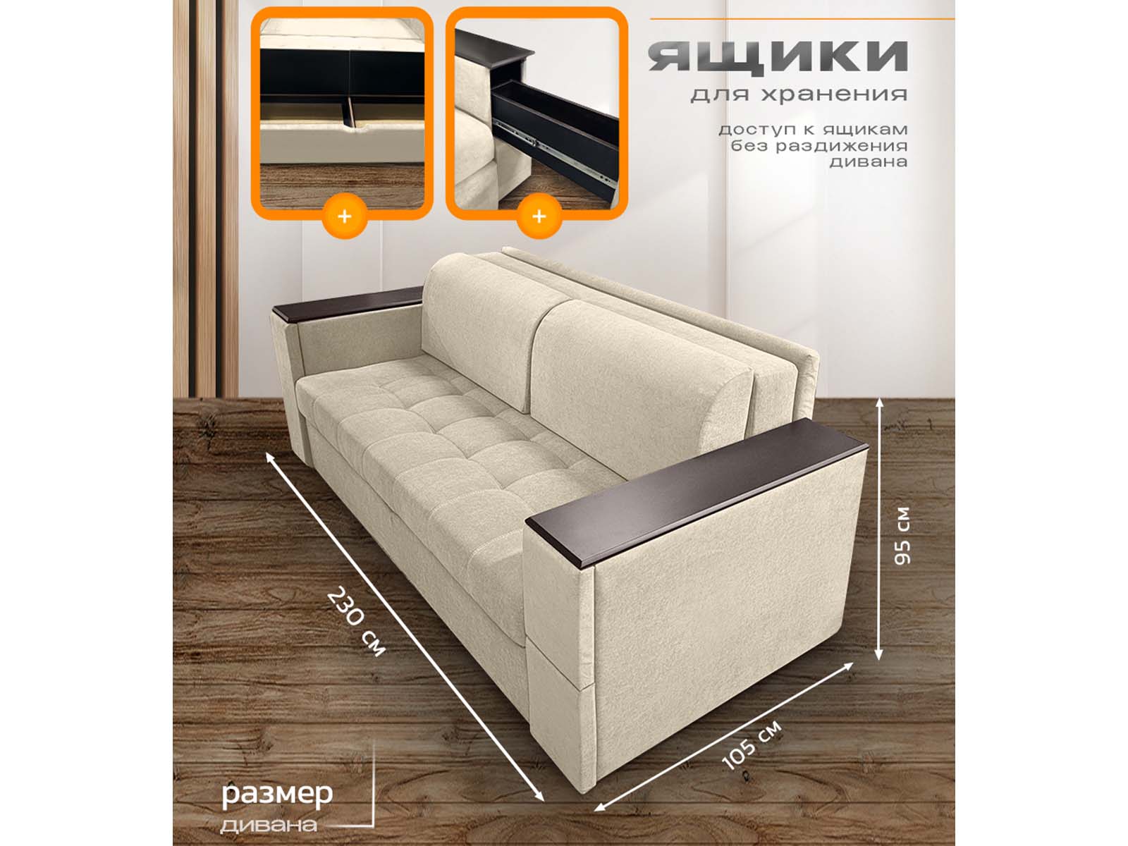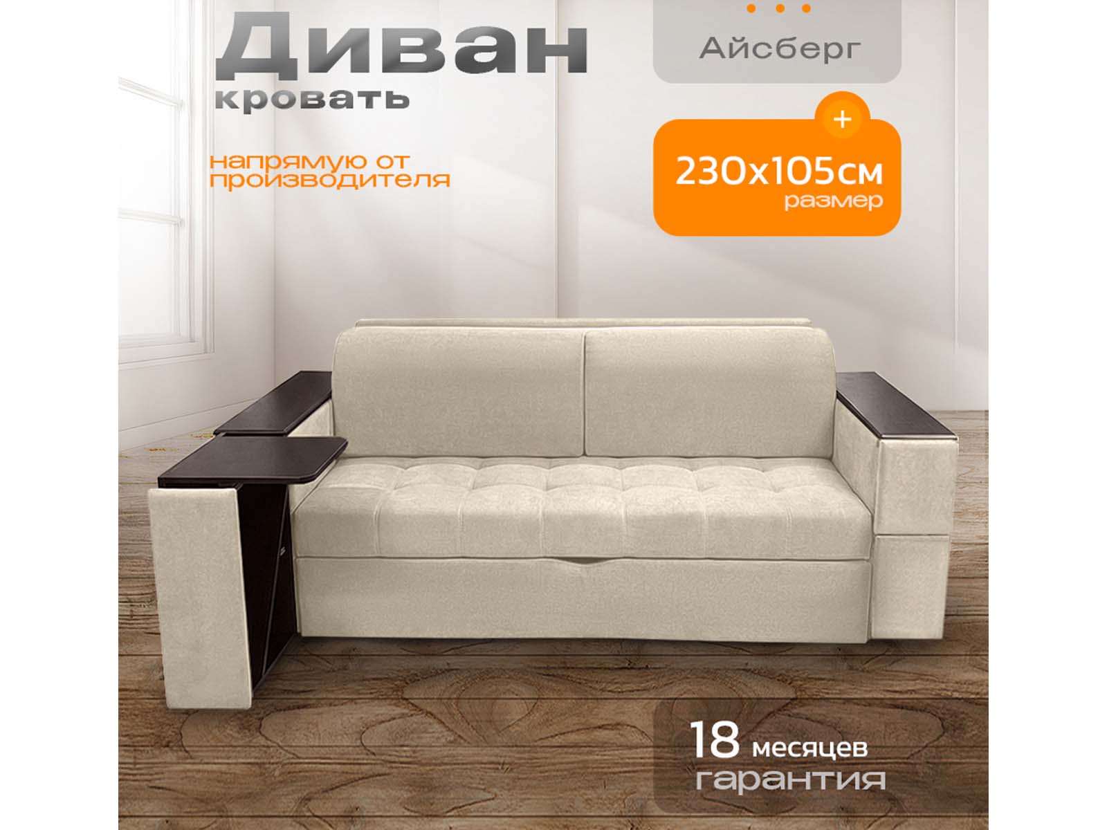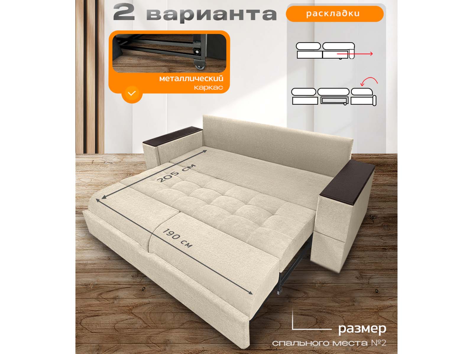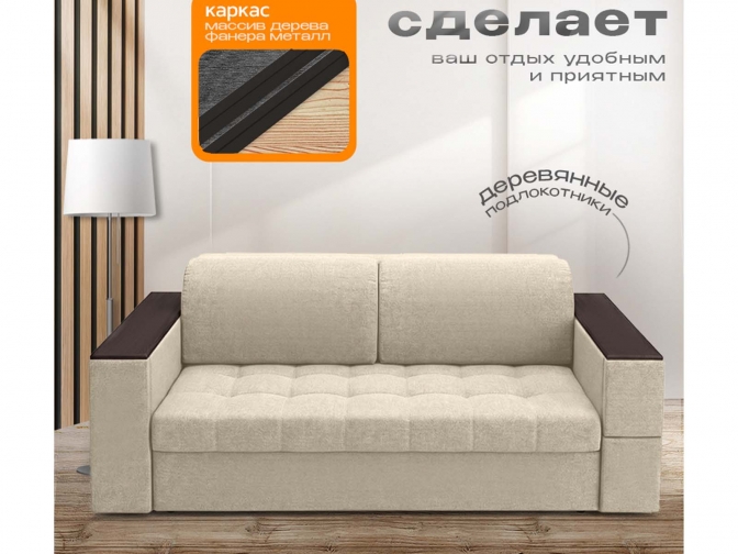 Диван Айсберг столики, декоры на подлокотниках, на металлокаркасе, спальное 190x200, независимый пружинный блок, тройная трансформация / бежевый
