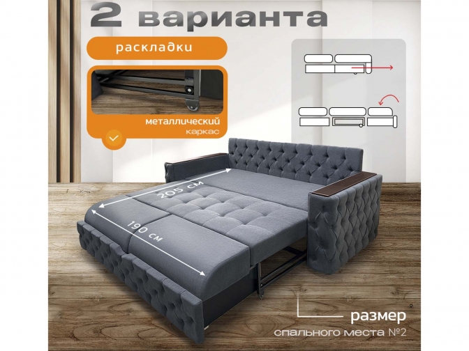 Диван Айсберг каретка, декоры на подлокотниках, на металлокаркасе, спальное 190x200, независимый пружинный блок, тройная трансформация / темно-серый
