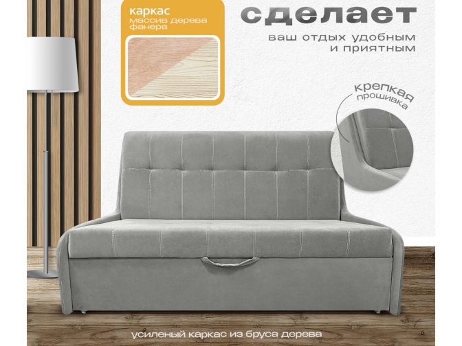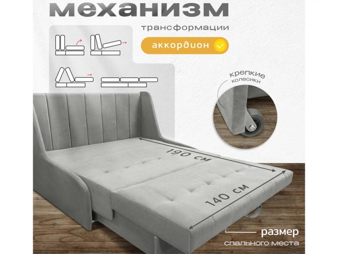 Диван кровать аккордеон Поль 2 без подлокотников, спальное место 140*190 см, с ящиком для белья, велюр серый