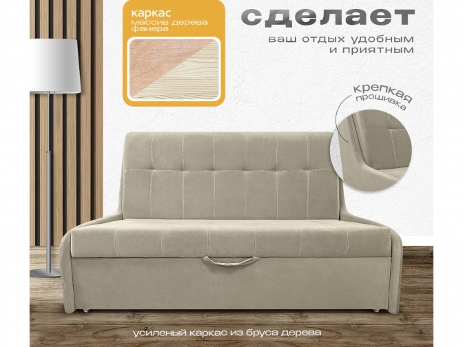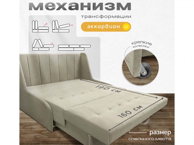 Диван кровать аккордеон Поль 2 без подлокотников, спальное место 160*190 см, с ящиком для белья, велюр бежевый