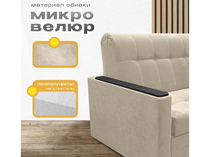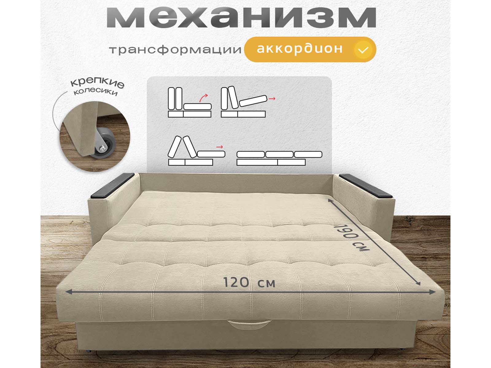 Диван кровать аккордеон Поль с декорами на подлокотниках, спальное место 120*190 см, с ящиком для белья, велюр бежевый - гармония уюта и простоты. Механизм раскладывается легко, превращая диван в полноценное спальное место. Благодаря беспружинному наполнителю нагрузка распределяется равномерно — никаких провалов и бугров. Деревянные накладки на подлокотниках добавляют тёплую, натуральную ноту в дизайн. А в сложенном виде модель занимает минимум места — настоящий друг малогабаритных квартир.
