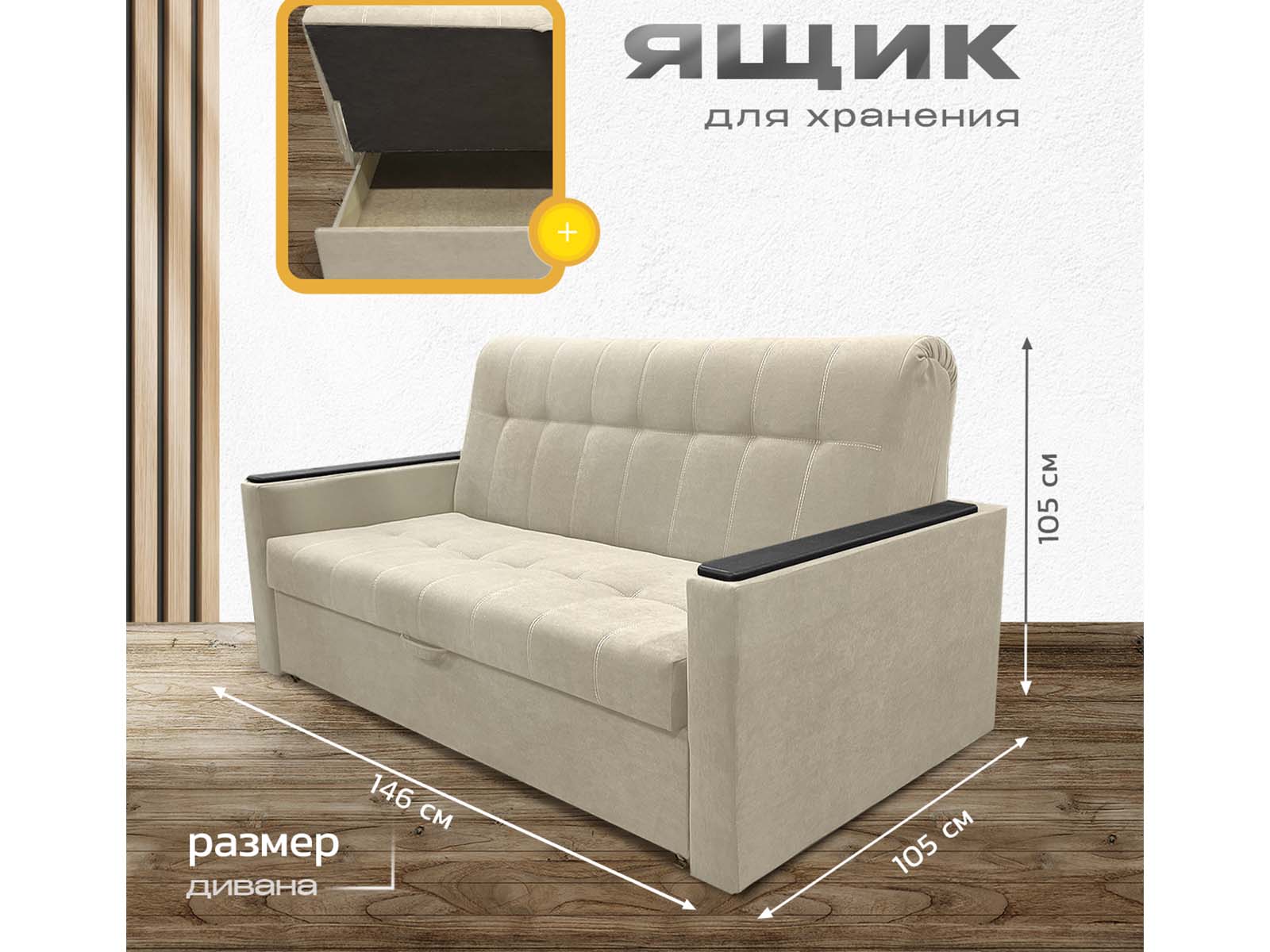 Диван кровать аккордеон Поль с декорами на подлокотниках, спальное место 120*190 см, с ящиком для белья, велюр бежевый