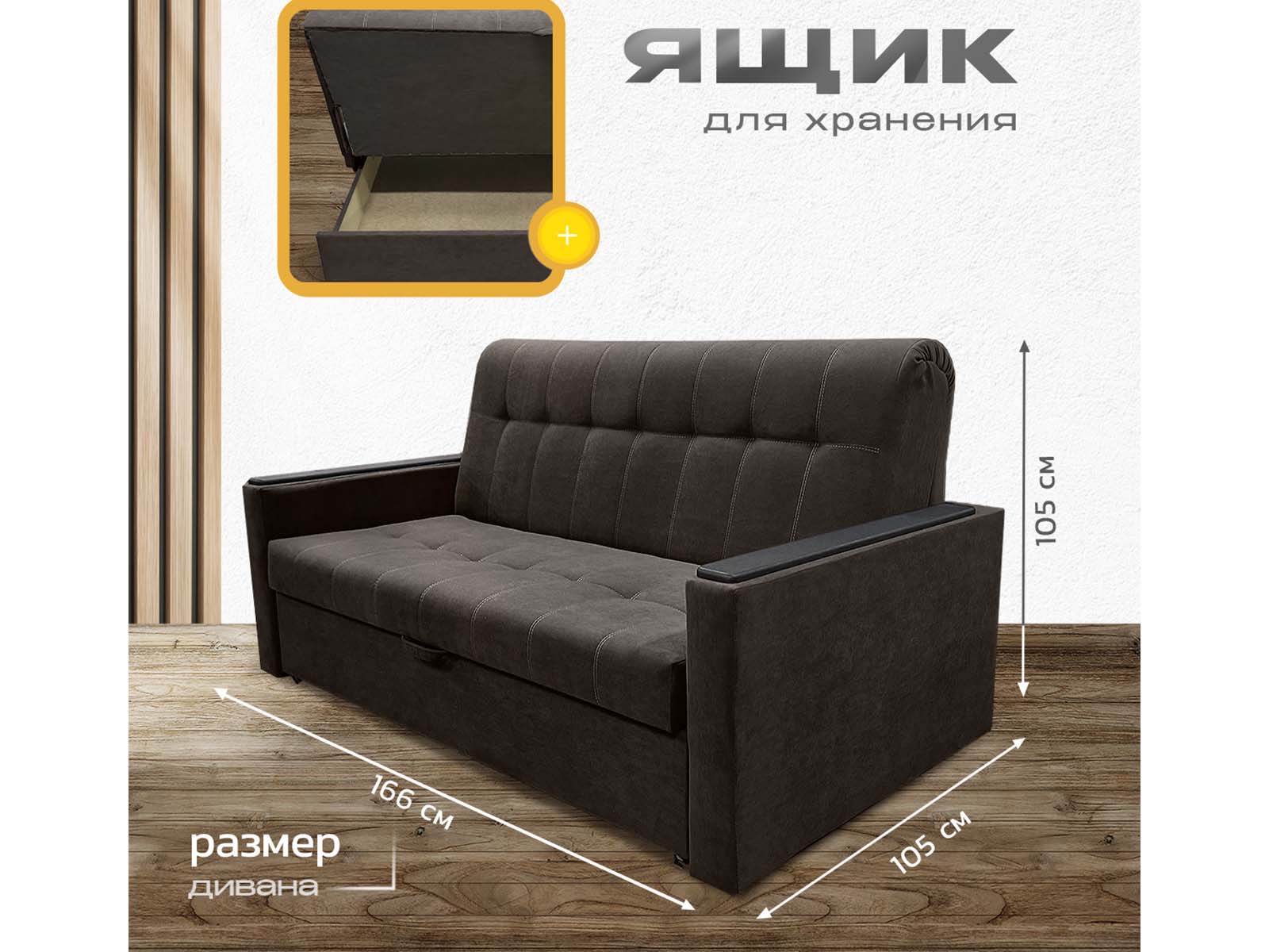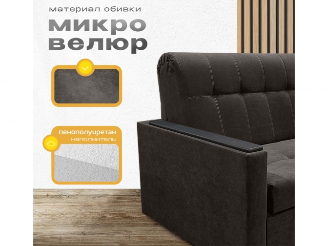 Диван кровать аккордеон Поль с декорами на подлокотниках, спальное место 140*190 см, с ящиком для белья, велюр темно-коричневый - гармония уюта и простоты. Механизм раскладывается легко, превращая диван в полноценное спальное место. Благодаря беспружинному наполнителю нагрузка распределяется равномерно — никаких провалов и бугров. Деревянные накладки на подлокотниках добавляют тёплую, натуральную ноту в дизайн. А в сложенном виде модель занимает минимум места — настоящий друг малогабаритных квартир.