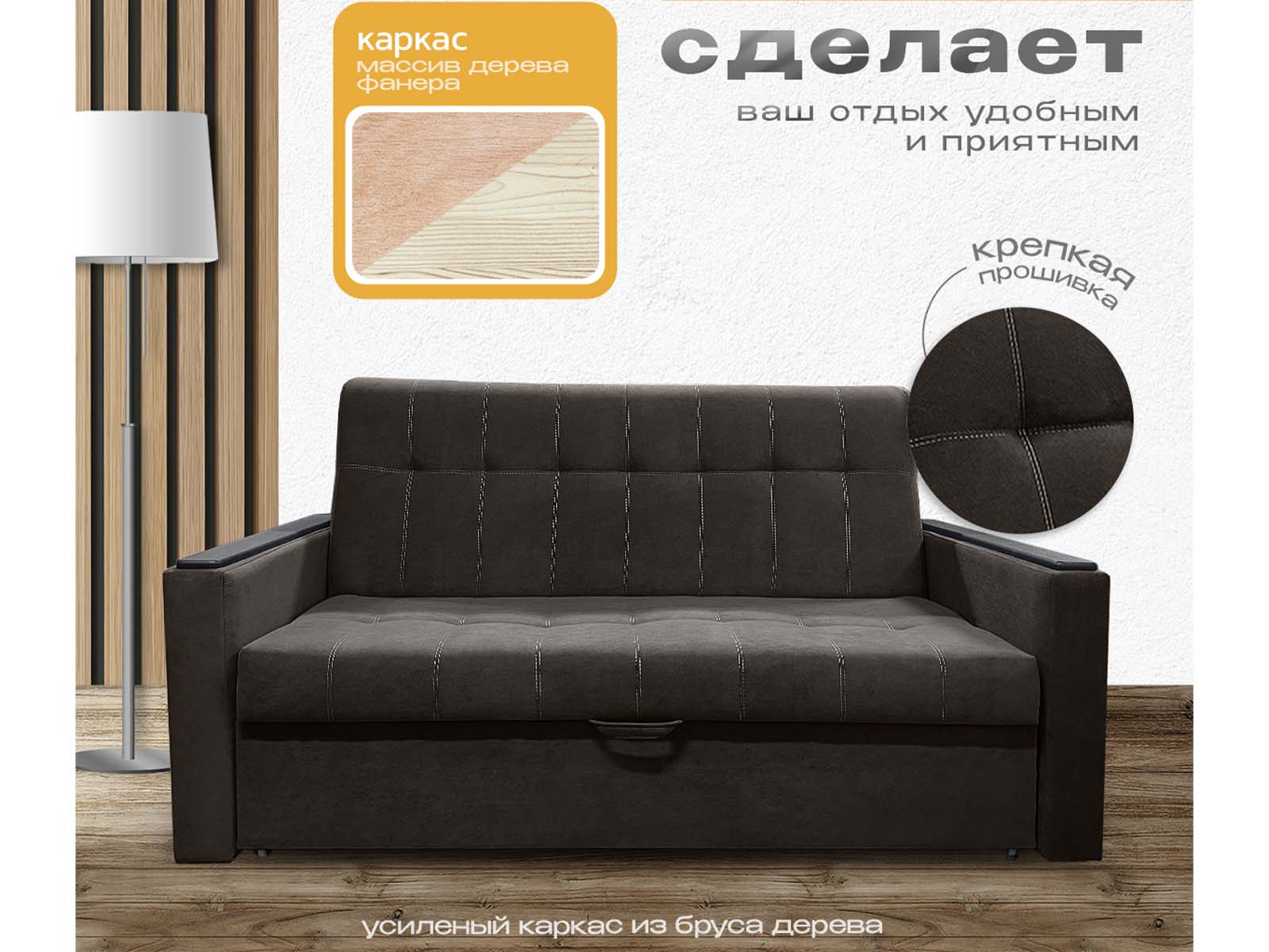 Диван кровать аккордеон Поль с декорами на подлокотниках, спальное место 140*190 см, с ящиком для белья, велюр темно-коричневый