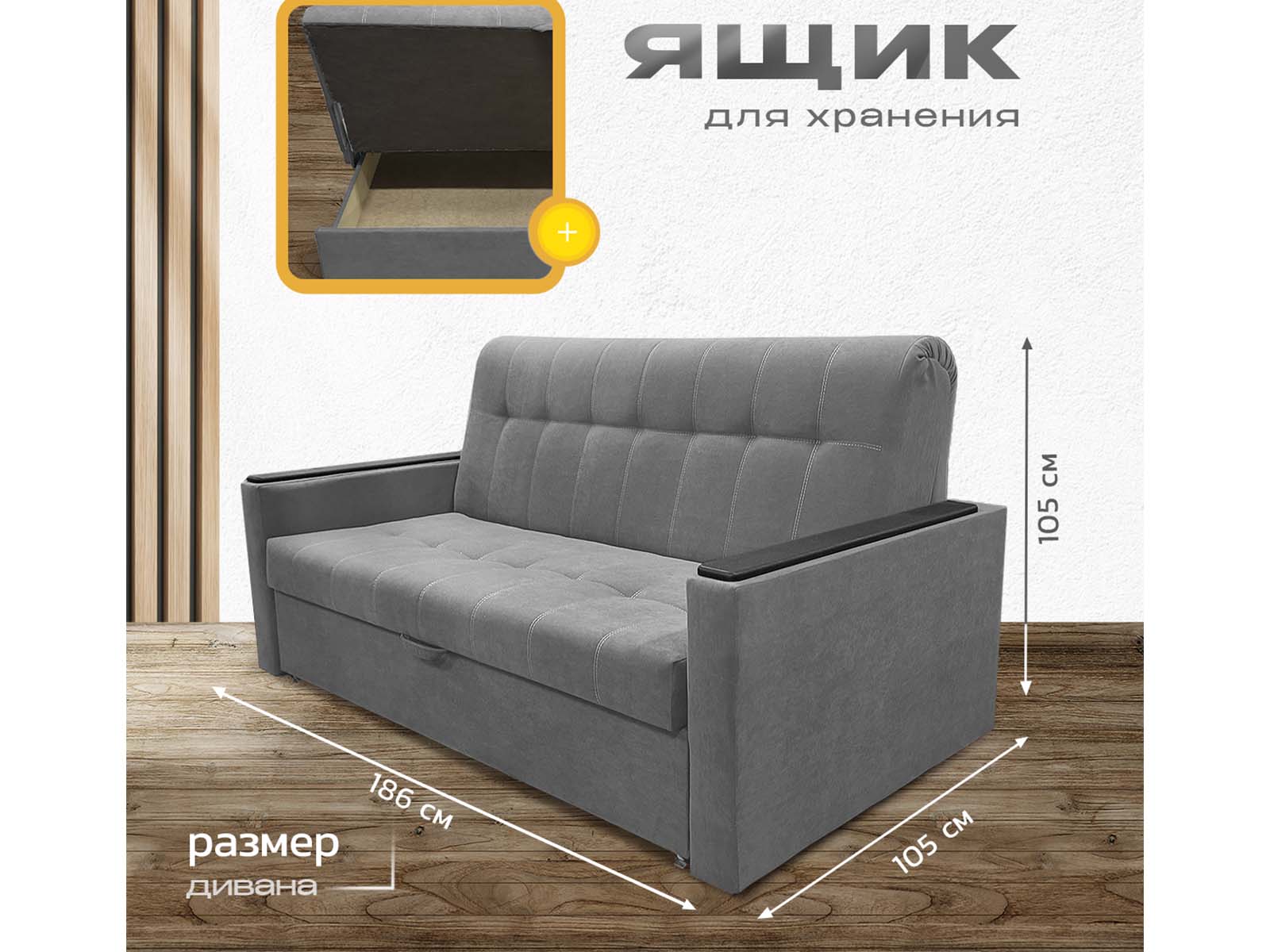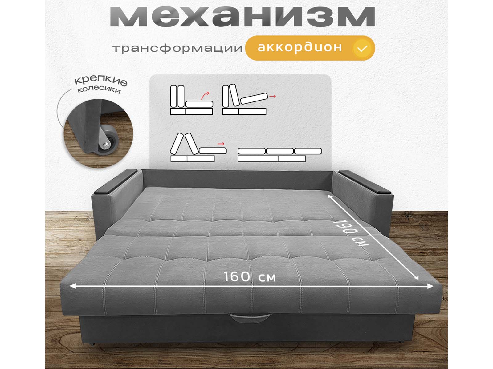 Диван кровать аккордеон Поль с декорами на подлокотниках, спальное место 160*190 см, с ящиком для белья, велюр серый - гармония уюта и простоты. Механизм раскладывается легко, превращая диван в полноценное спальное место. Благодаря беспружинному наполнителю нагрузка распределяется равномерно — никаких провалов и бугров. Деревянные накладки на подлокотниках добавляют тёплую, натуральную ноту в дизайн. А в сложенном виде модель занимает минимум места — настоящий друг малогабаритных квартир.