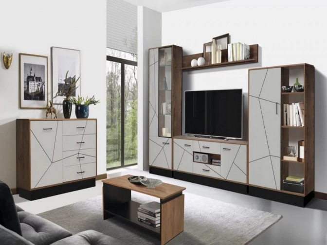 Цена указана за элементы на фото: Шкаф-пенал Гамма 54.01 + Тумба под ТВ Гамма 54.04 + Шкаф комбинированный Гамма 54.06 + Комод Гамма 54.08 + Полка навесная Гамма 54.10 + Стол журнальный Гамма 54.11