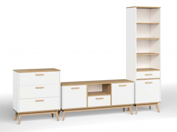 Гостинная Алатея - современный мебельный набор для организации пространства под телевизор и хранения аксессуаров. Модульная конструкция на декоративных ножках сочетает функциональность и стильный дизайн.
