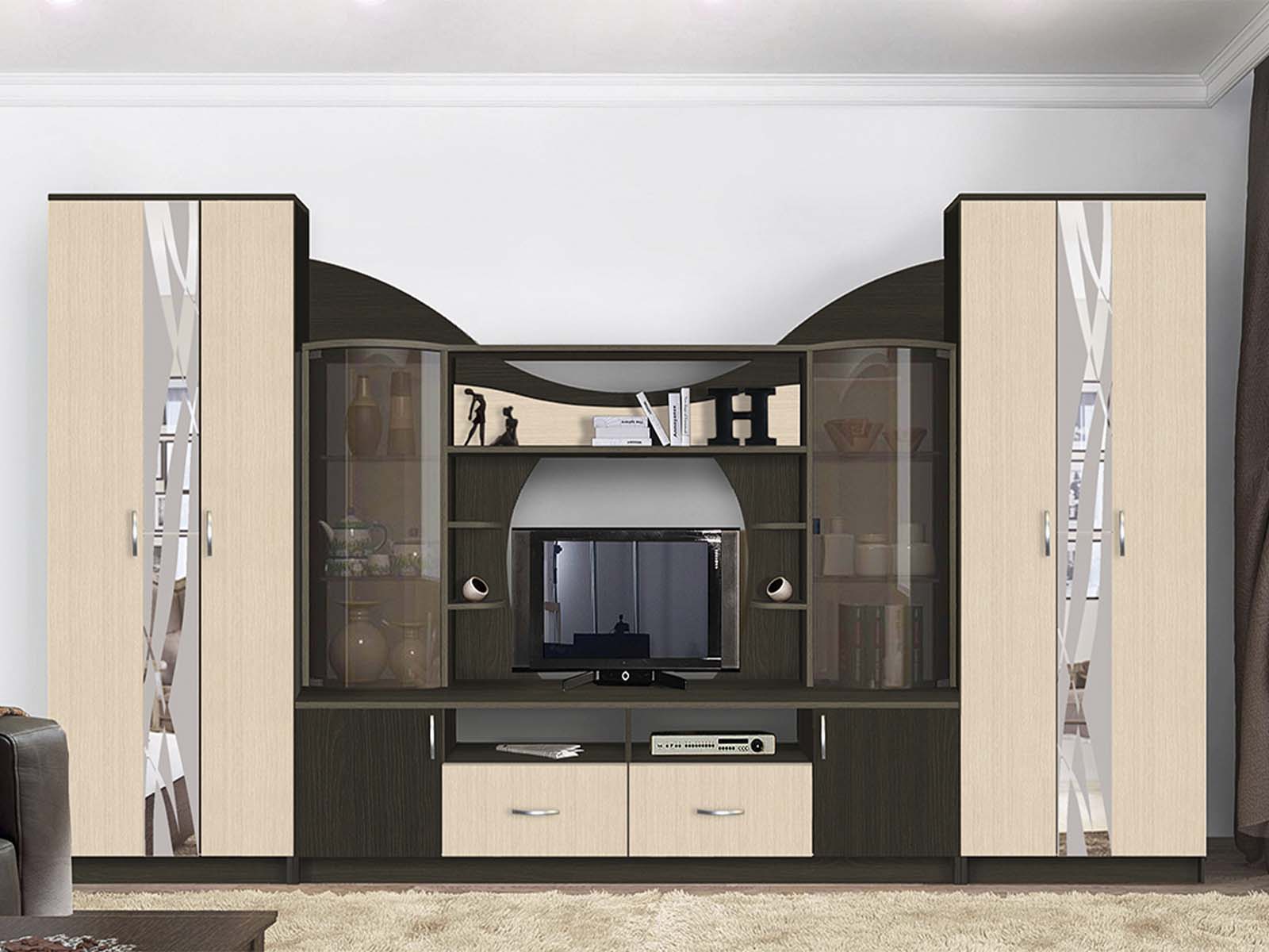 Гостиная Аллегро 5 - гостиная, сочетающая элегантность и функциональность. В комплект входят тумба под ТВ, открытая полка, витрины с гнутыми стеклами для эффектной демонстрации и два шкафа для скрытого хранения. Комбинированная расцветка позволяет модели гармонично вписаться в любой интерьер, добавляя ему стиля и организованности.