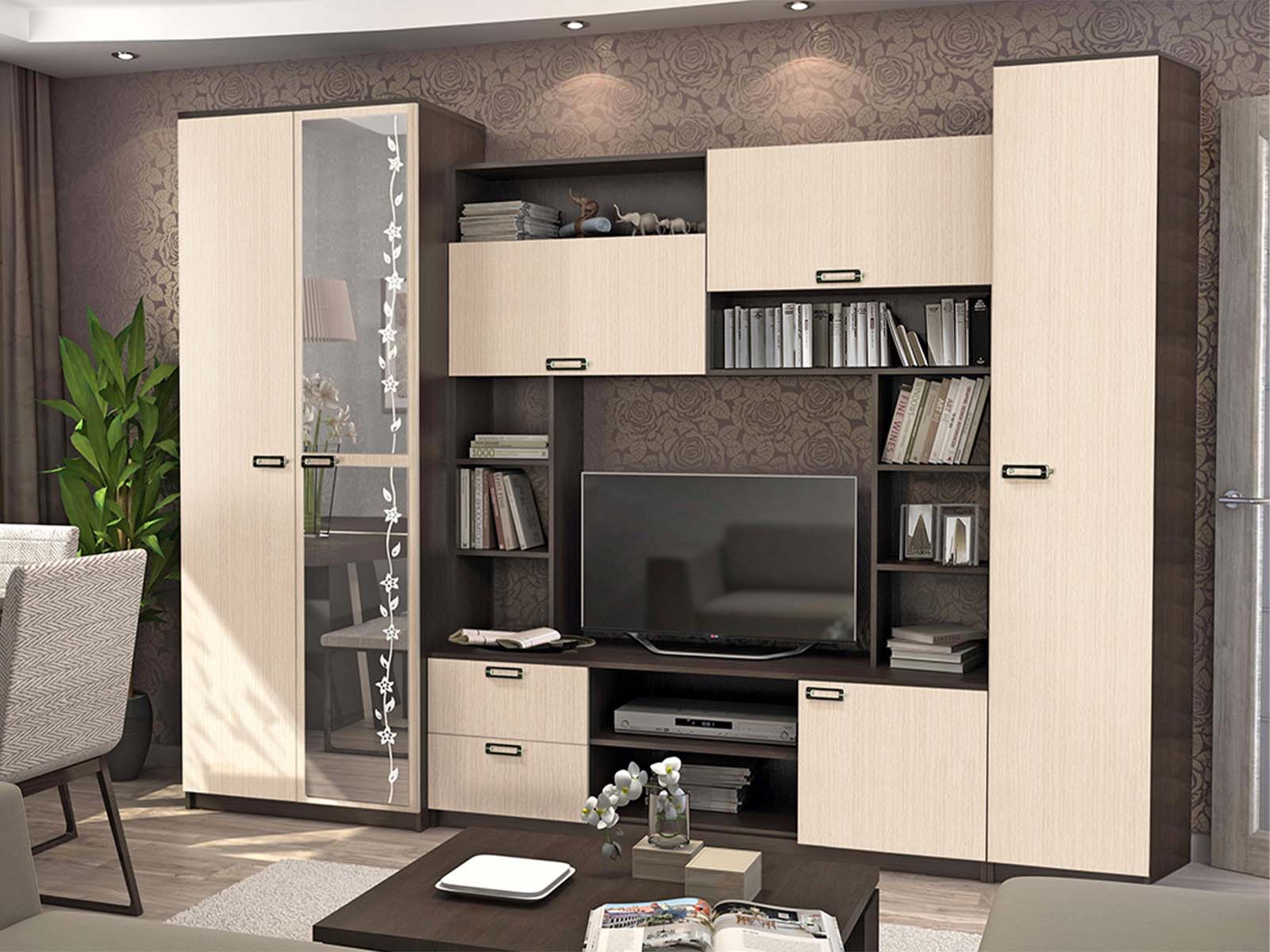 Гостиная Аллегро 6 - предлагает тумбу под технику, открытые полки и вместительные шкафы для системного хранения. Ящики на роликовых направляющих обеспечивают удобство эксплуатации, а двухцветный дизайн делает эту модель стильным и универсальным дополнением для современной гостиной.