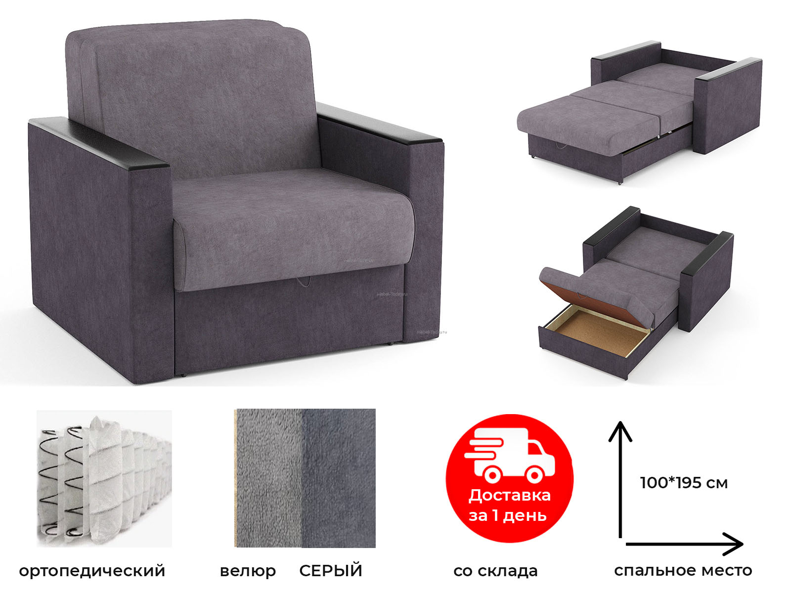 Обивка по фото - серый велюр. В наличии 1 шт. Цена по акции