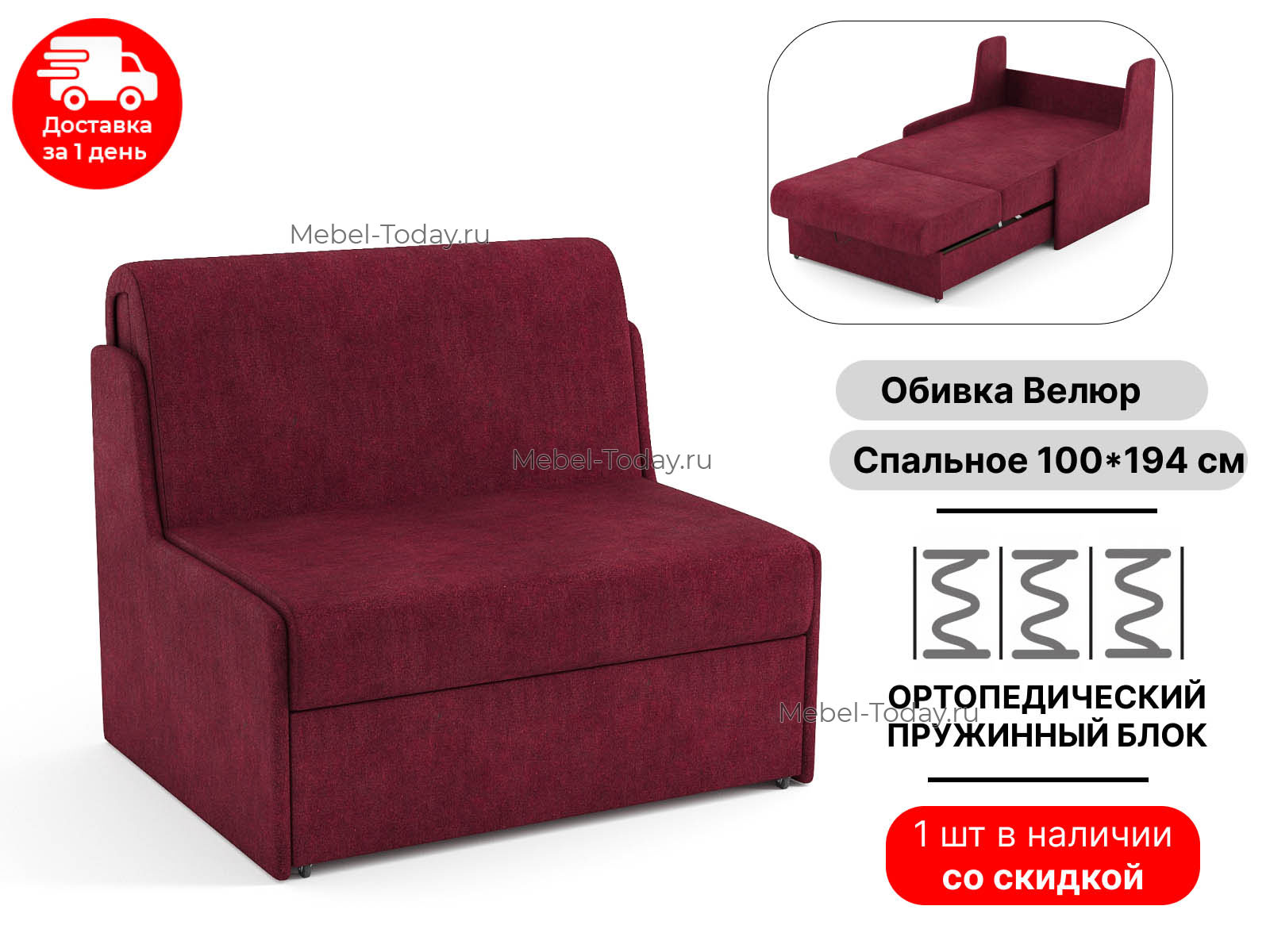 Диван Сицилия 100 см, аккордеон, без подлокотников ортопедический, спальное место 100х194, ящик для белья, обивка велюр мятный, по акции распродажа