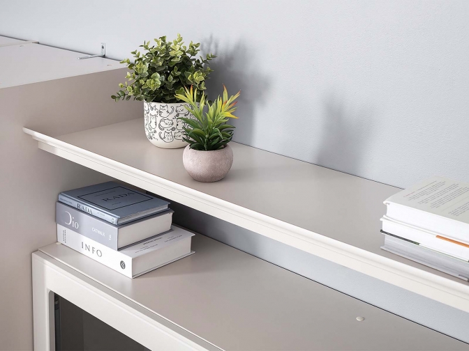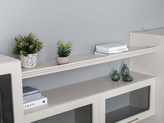Полка Ричфорд 16.492 - Коллекция «Ричфорд» воплощает современную классику, где каждая деталь продумана для вашего комфорта. Фрезерованные фасады из МДФ в сочетании с металлическими ручками и тонированными стеклянными витринами создают элегантный облик. А умные решения — доводчики, система полного выдвижения ящиков, выдвижная штанга для одежды и регулируемые полки — делают организацию пространства невероятно удобной.
